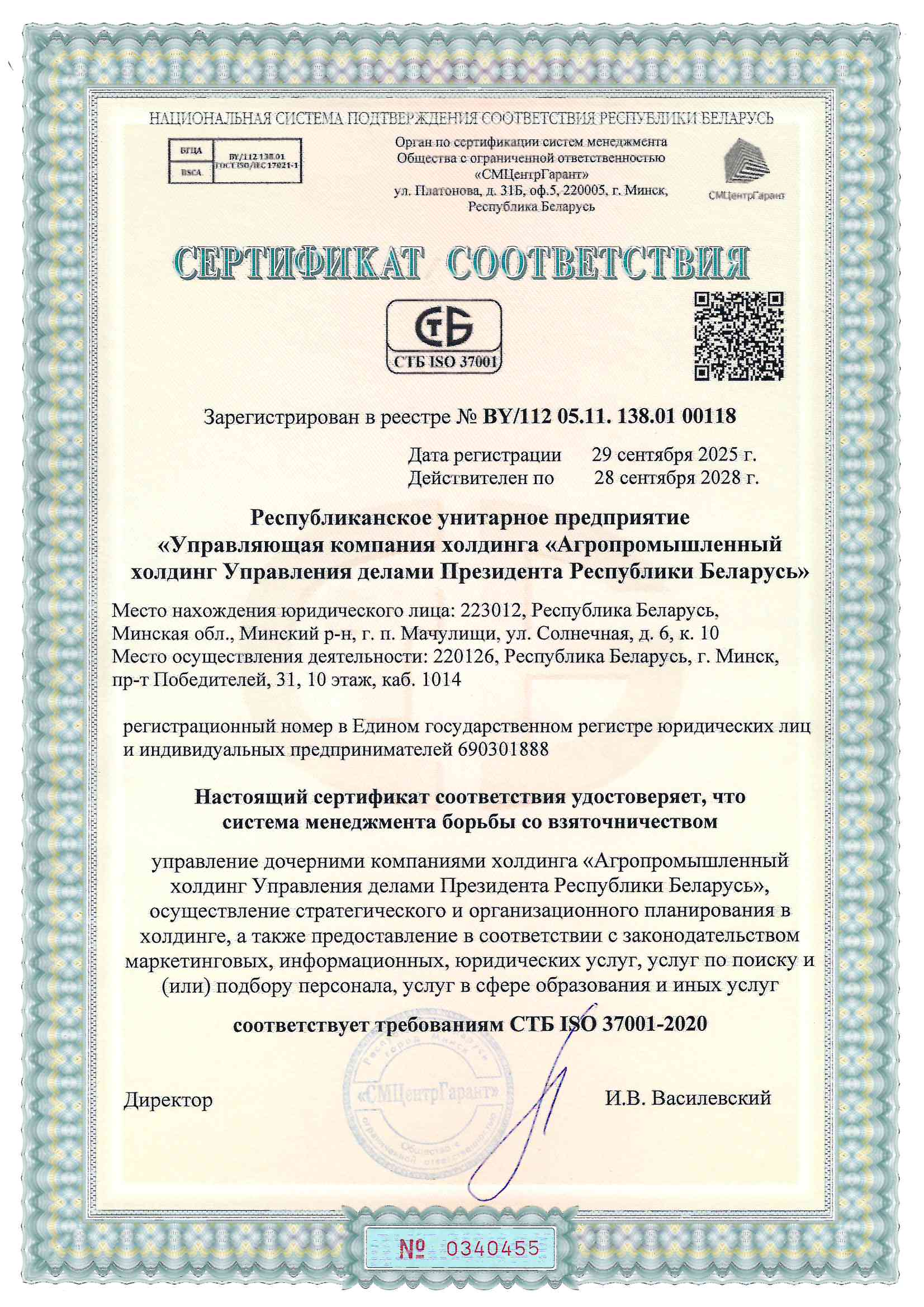 СЕРТЫФІКАТ АДПАВЕДНАСЦІ СТБ ISO 37001-2020